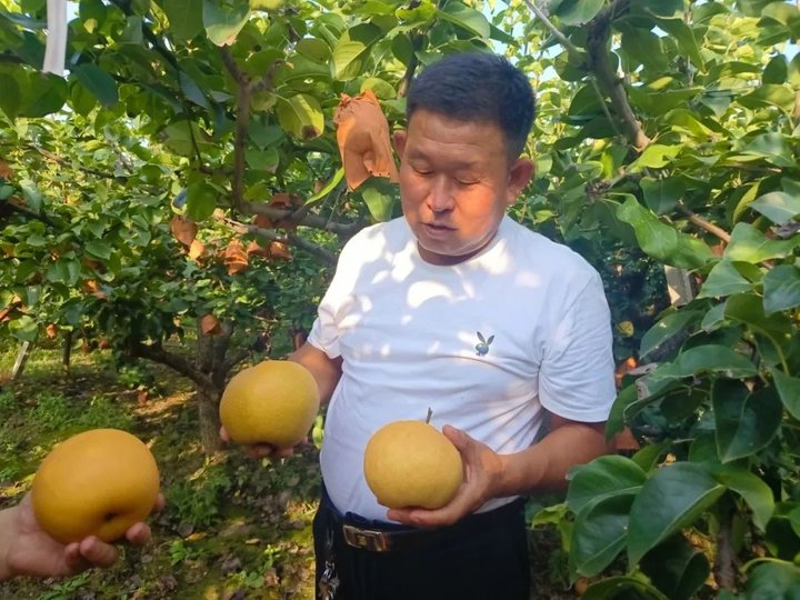 “這個梨得2斤多,今年的果子個頭都特別大!”鎮(zhèn)里的果農(nóng)商掂著手中的秋月梨,樂呵呵地介紹著。