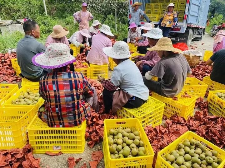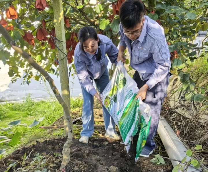 ▲中廣核樂業(yè)生物資源利用有限公司工作人員幫助果農(nóng)施用“禾能壹號”有機肥